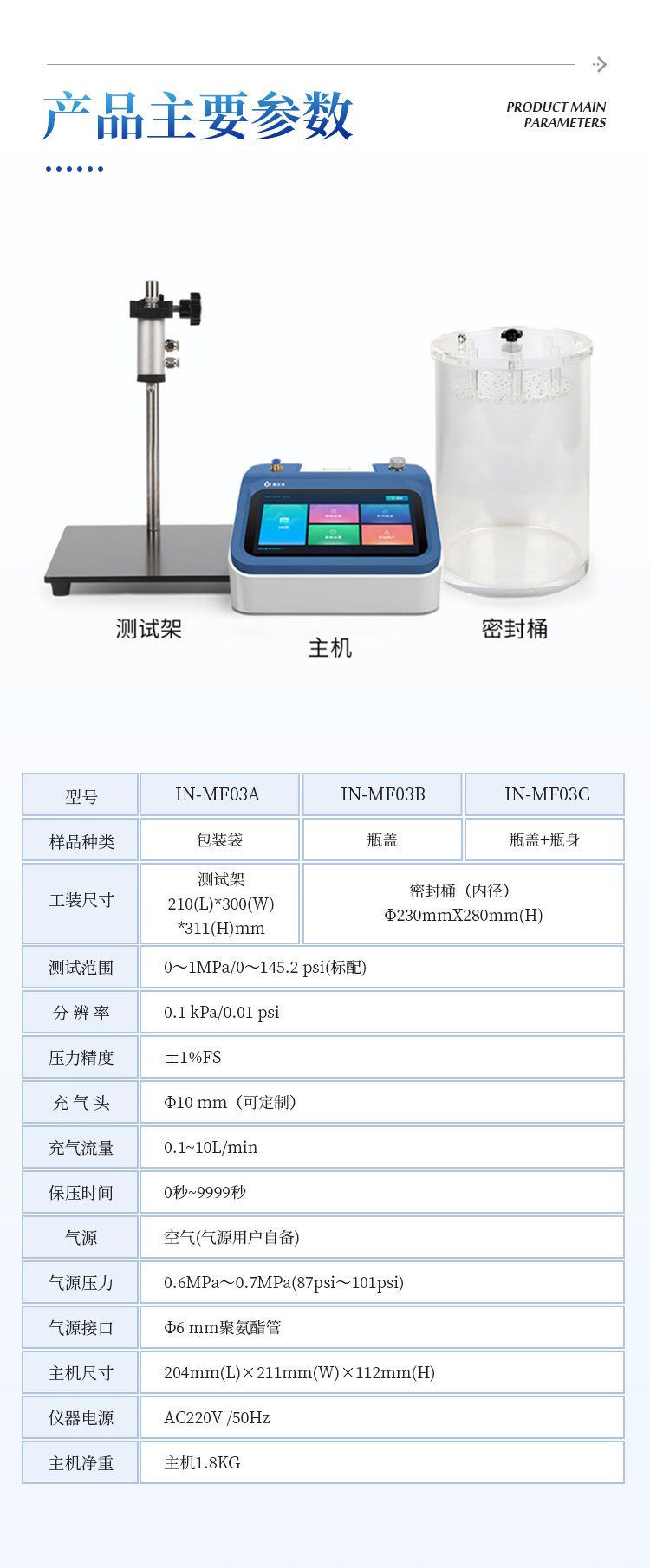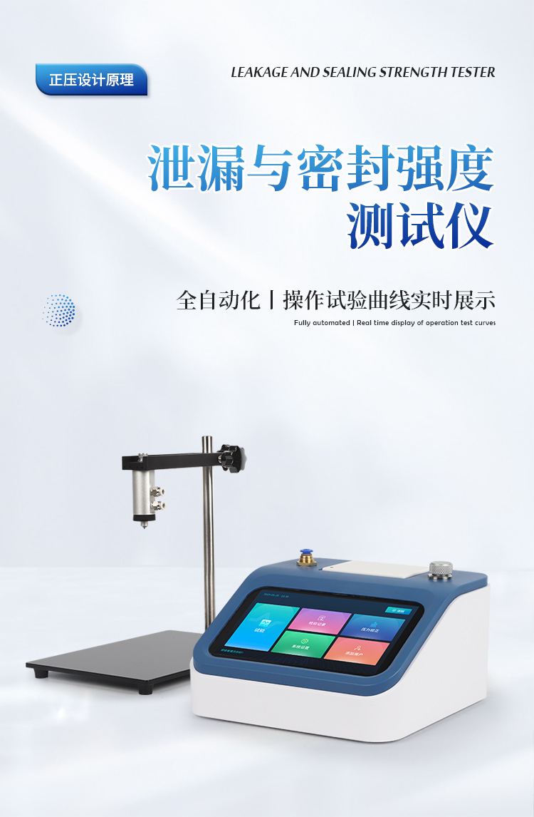 泄漏与密封强度测试仪,专业适用于各种热封、粘接工艺形成的软包装件、无菌包装件等各封边的封口强度、热封质量、以及整袋胀破压力、密封泄漏性能的量化测定;对软包装袋所使用材料的抗压强度、耐破强度等指标分析;各种塑料防盗瓶盖密封性能、瓶盖连接脱扣强度、材料的应力强度的量化测定;瓶体密封性、抗压性、耐破性等评估分析。通过正压法来进行测试,模拟实际使用环境下的密封强度、泄漏性能和耐压极限,为各行业的包装质量管控提供可靠的依据。