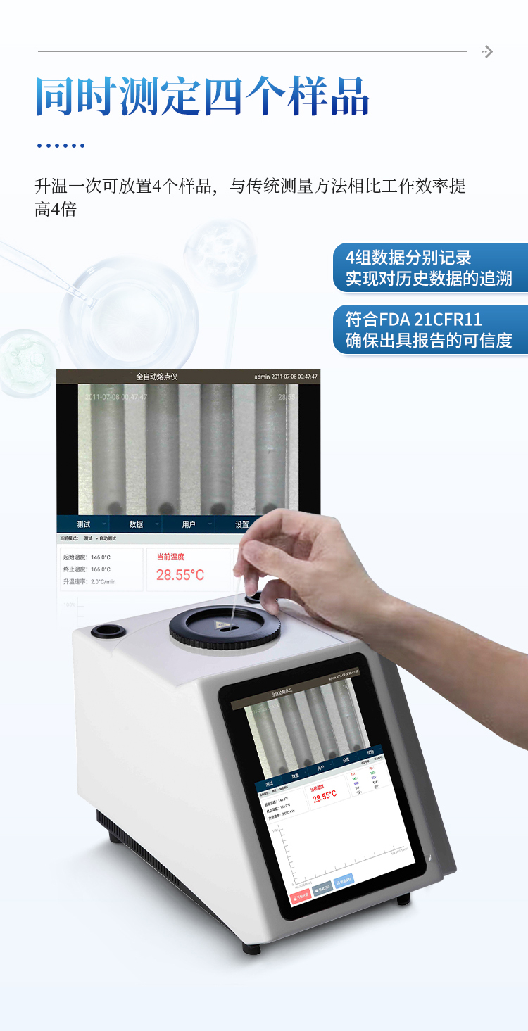 简要描述: 全自动视频熔点仪自动化集成,实现一键测定功能;一次处理4个样品;高清视频代替传统显微镜 目视高;全自动记录熔程,初熔,终熔;可通过打印机直接打印数据。可同时测定四个样品:升温一次最多放置4个样品,与传统测量方法相比工作效率提高4倍,且4组数据分别记录实现对历史数据的追溯,符合FDA 21CFR11确保出具报告的可信度。