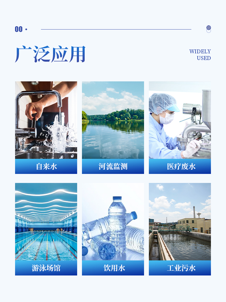 适用于饮用水、自来水、医疗废水、工业污水、河流监测、游泳场馆、水源保护、科研实验等。