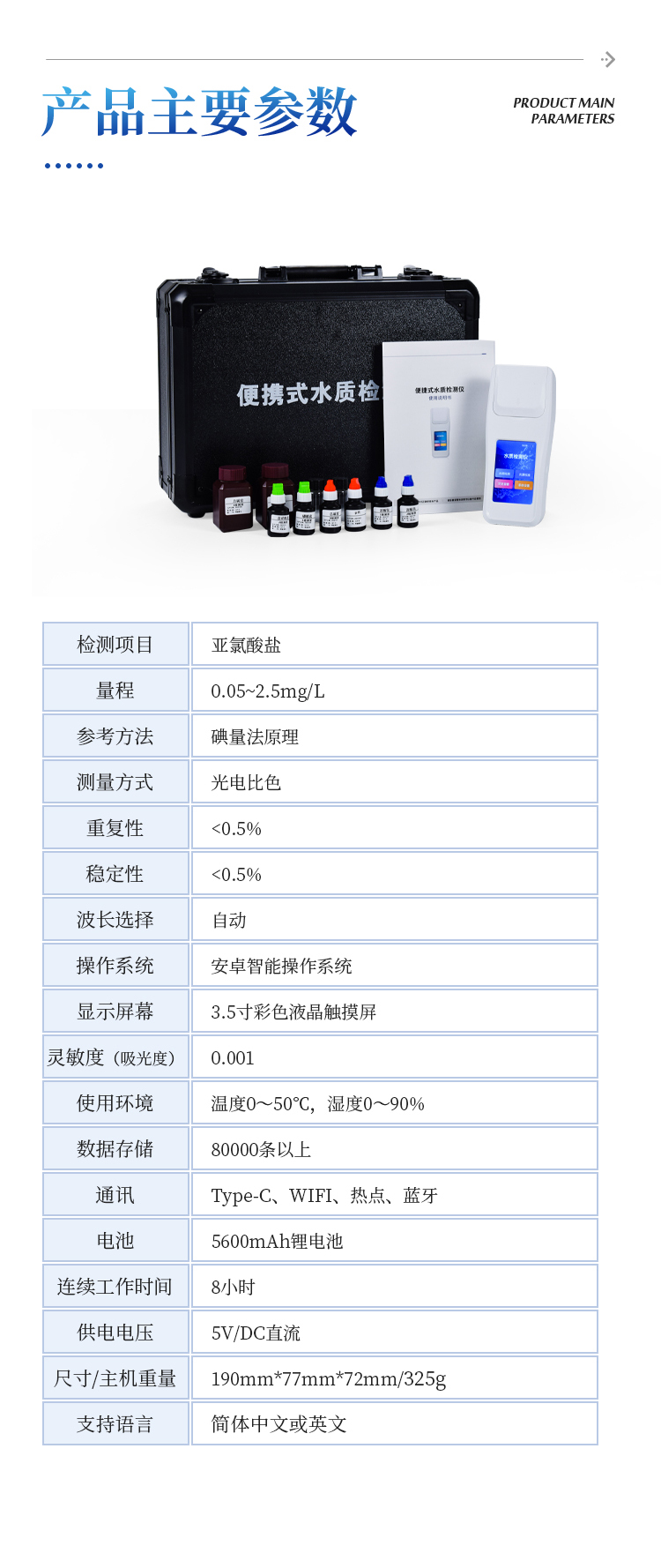 简要描述: 亚氯酸盐检测仪安卓智能系统,操作更佳简便快捷;配置云监控平台,检测结果可直接无线传至平台,进行水质长短期分析,辅助管理。内置操作流程、操作简单、无需培训、直接上手;检测速度更快,现场读取数据;便携式体积小,重量轻,方便户外检测。