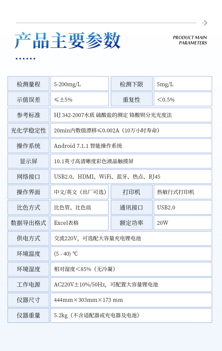 本仪器主要检测水中硫酸盐含量指标,兼具智能数据分析功能,图表、列表显示数据,分析一目了然;高清晰度彩色液晶触摸显示屏,Android智能操作系统,中文显示界面,中英文键盘,人性化操作,使用更简单。