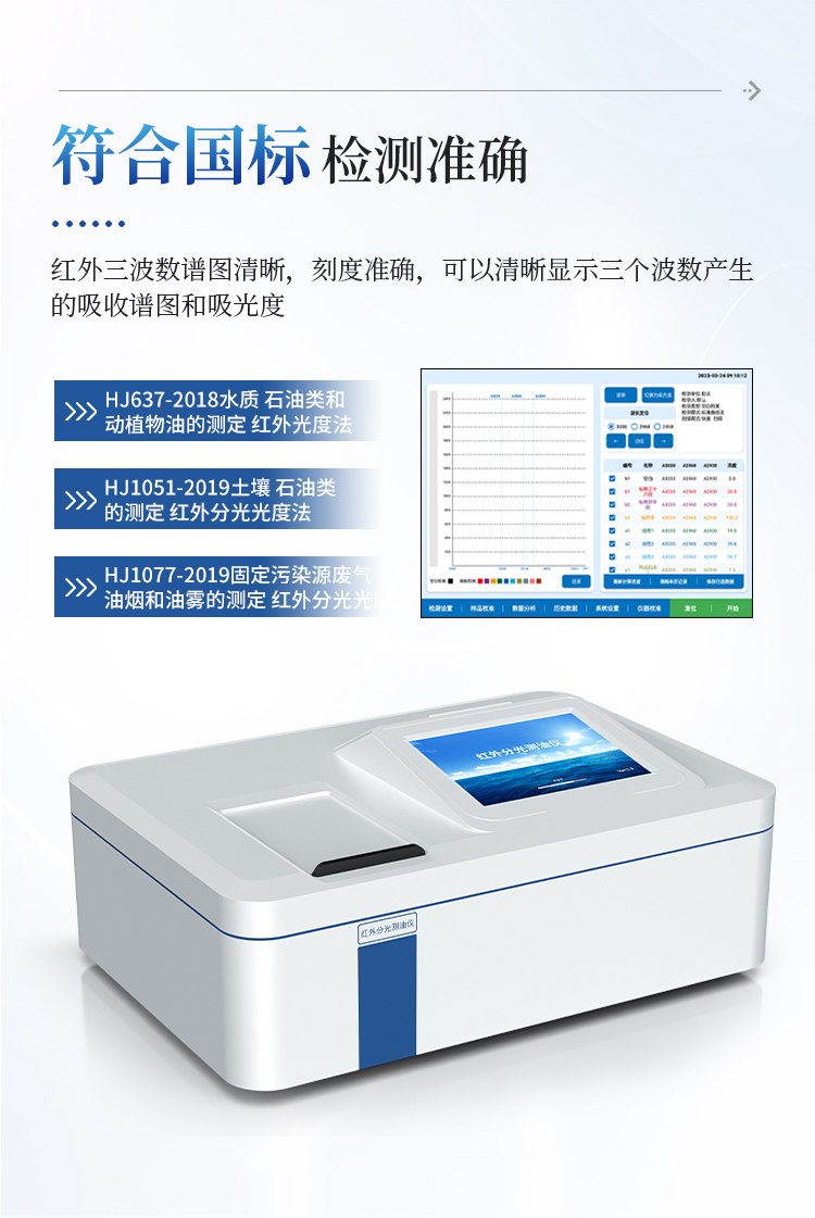 1)本产品采用了国标规定的校正系数法检测原理,严格按照国标标准公式,使用20mg/L正十六烷,20mg/L异辛烷,100mg/L苯进行校准,最终带入校准公式算出仪器校正系数进行测量样品(也可以使用标准曲线法进行检测);
