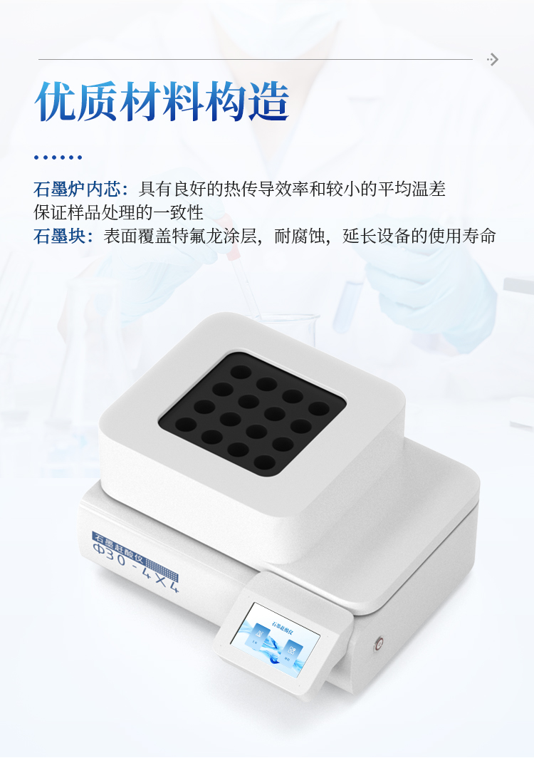 采用优质石墨炉内芯,平均温差较小,样品效果一致性好,热传导效率更高。石墨块具有特氟龙涂层,耐腐蚀,延长使用寿命。