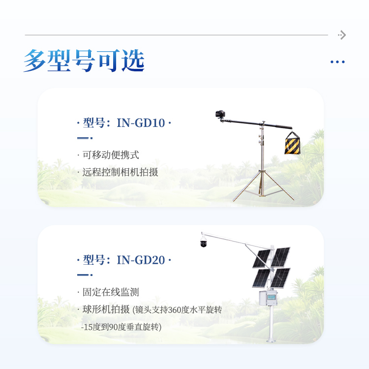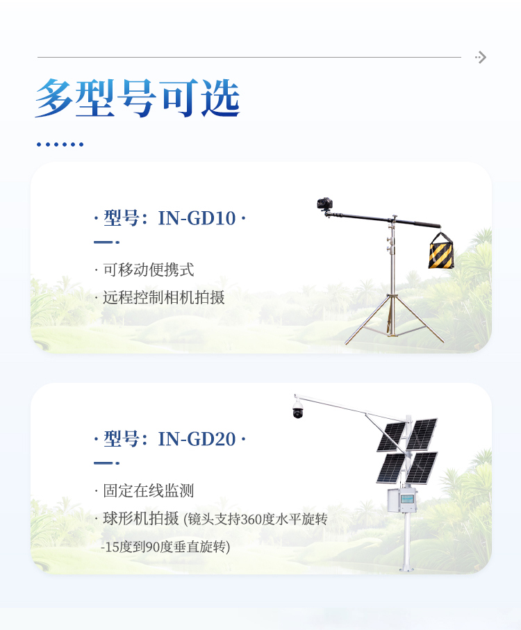 简要描述: 植被盖度仪IN-GD20根据图像识别原理来实现自动分析,用于植被覆盖度和郁闭度的精确测量。仪器具有良好的防水性能,并带有太阳能供电系统,可在户外环境下长期自动定时采集分析,获取植被长期生长变化情况。软件提供丰富的图像分割模式,软件内置植被、土壤特征模型,支持广泛地域植被盖度和郁闭度测量计算。