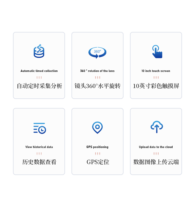 4. 分析主机:10寸彩色触摸显示屏,支持自动和手动阈值调节;自动区分植被与非植被区域;支持镜头方向调节、焦距设置;支持历史数据查看、导出及中英文语言切换。