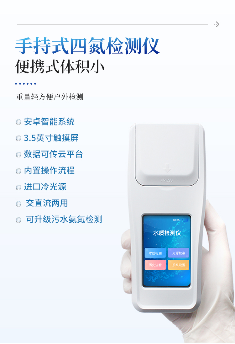 简要描述: 硝酸盐氮测定仪是参考方法《变色酸光度法》研发设计制造,主要检测水质硝酸盐氮浓度指标,兼具智能数据分析功能,图表、列表显示数据,分析一目了然;高清晰度彩色液晶触摸显示屏,Android智能操作系统,中文显示界面,中英文键盘,人性化操作,使用更简单。