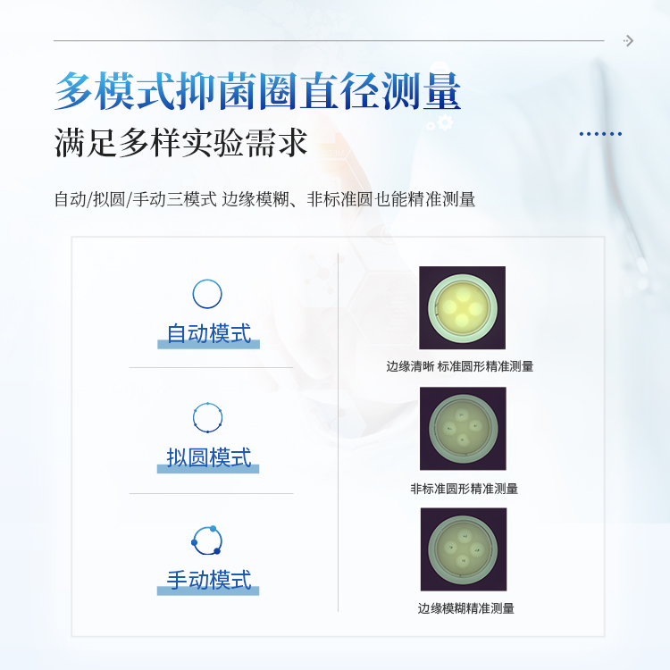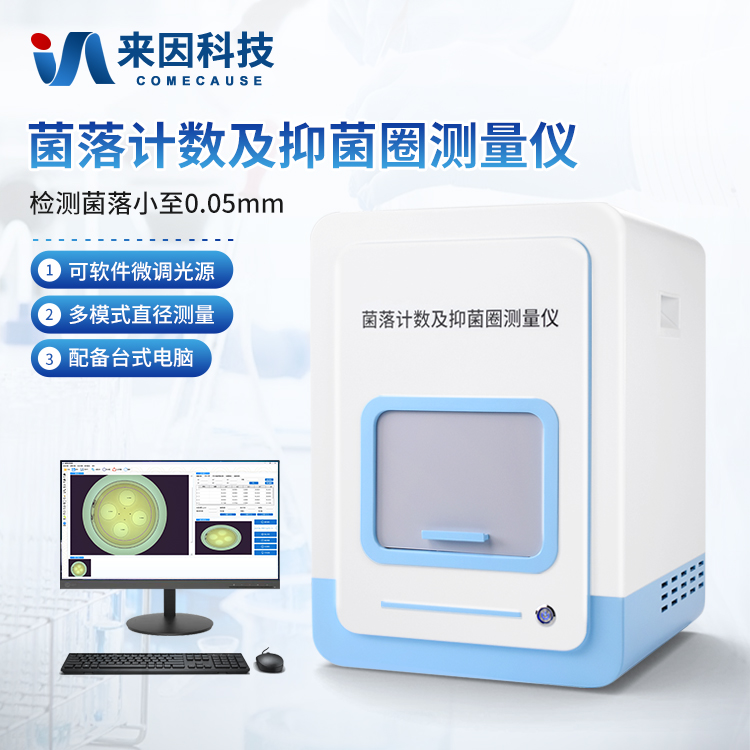 简要描述: 高精度抑菌圈测量及菌落计数仪是一款集图像采集、数据处理与统计分析于一体的菌落计数及抑菌圈测量仪,广泛应用于食品、药品、化妆品、环境监测、医疗卫生、科研院校等领域。仪器采用先进的数字图像处理技术,具备荧光菌识别、抑菌圈测量及效价测定和杀菌功能,可快速精准完成培养皿内菌落的测量分析、抑菌圈测量及抗生素效价测定,大幅提升实验效率,有效降低人工操作误差。