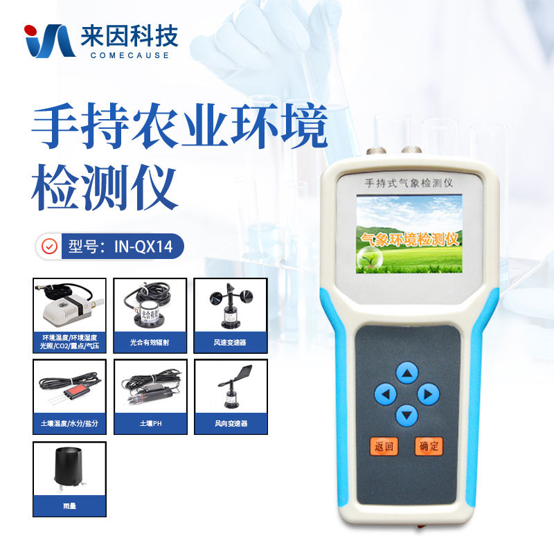 简要描述: 手持式农业气象监测仪IN-QX14是我们专门针对农田、草场局部小尺度环境设计的,对与植被和农作物生长密切相关的土壤、水气等环境参数监测的农田小气候站。它主要观测与农业相关的空气温度、空气湿度、光照强度、二氧化碳浓度、露点温度、光合有效辐射等5个环境参数气象要素,为农业科研、农业生产等提供良好的支持。
