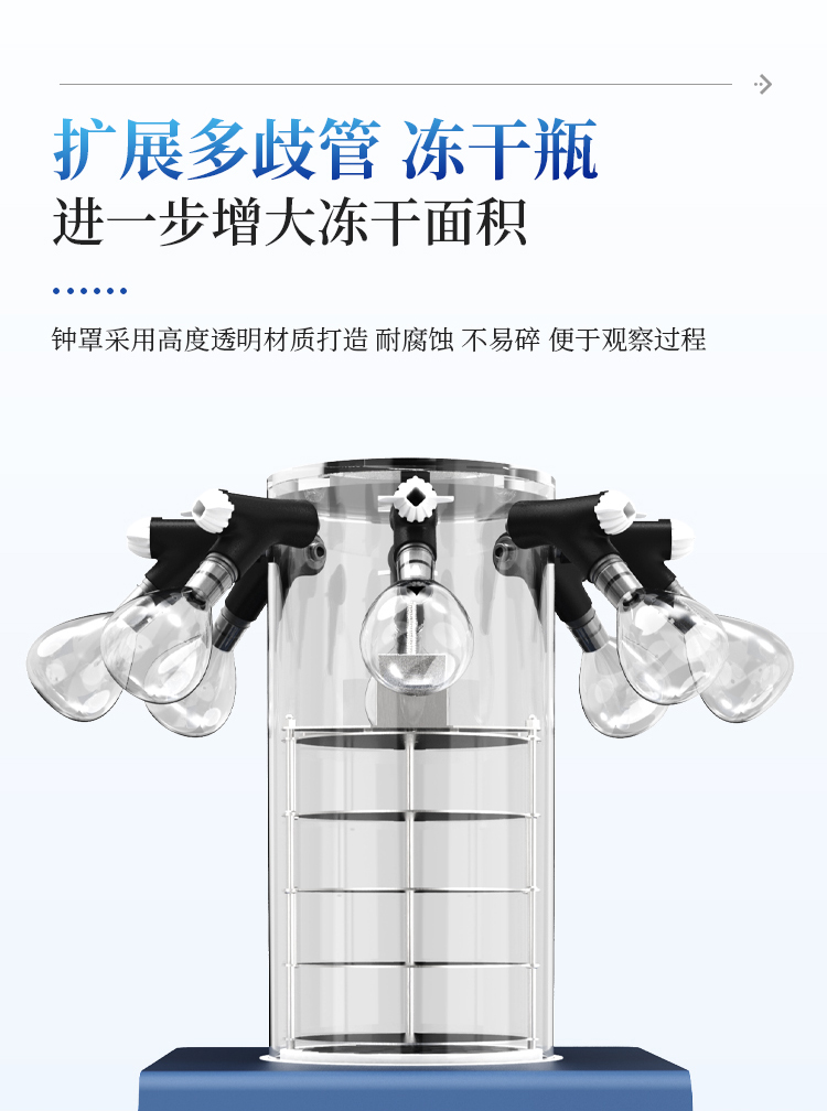(2) 钟罩采用高度透明材质打造,耐腐蚀、不易碎,便于观察样品的冻干过程。
