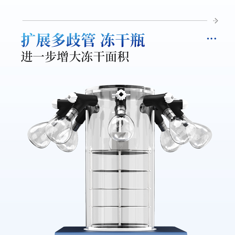 (1) 冻干面积最大0.19m²(普通型),物料盘尺寸φ200mm。支持扩展多歧管冻干瓶、茄型瓶,进一步增大冻干面积。(配备多歧管钟罩)