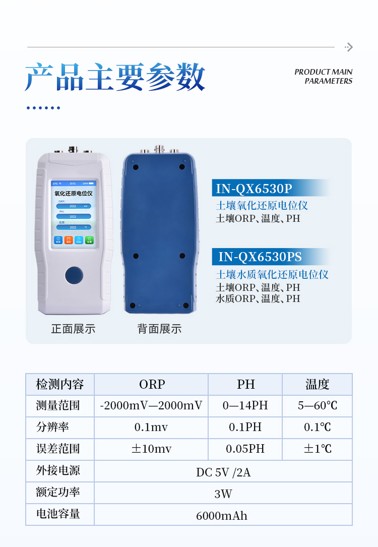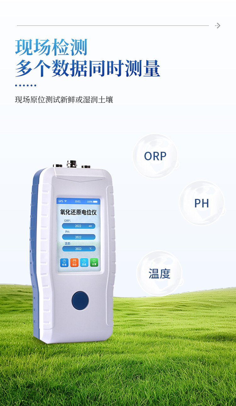 土壤氧化还原电位仪(ORP计)主要用于现场原位测试新鲜或湿润土壤的氧化还原电位,水(介质)氧化还原电位、PH、温度等数据的测量。符合《HJ746-2015土壤氧化还原电位的测定电位法》标准。