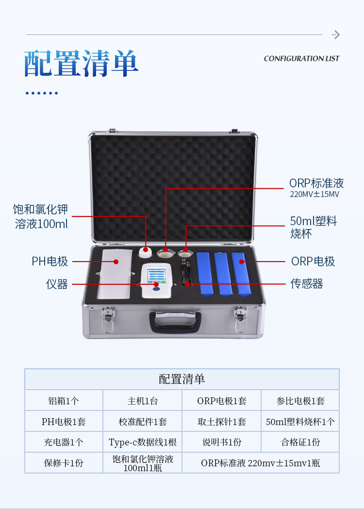 8.配套专用ORP电极、参比电极和不锈钢空心杄,可直接插入土壤