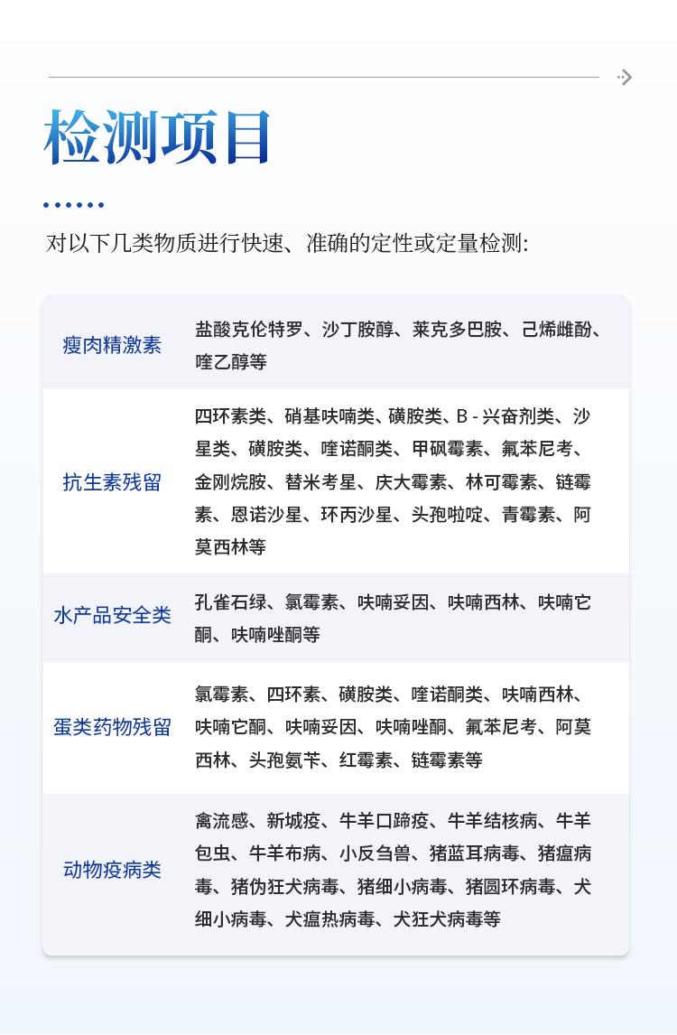 抗生素残留:四环素类、硝基呋喃类、磺胺类、β-兴奋剂类、沙星类、磺胺类、喹诺酮类,甲砜霉素,氟苯尼考,金刚烷胺、替米考星、庆大霉素、林可霉素、链霉素、恩诺沙星、环丙沙星、头孢啦啶、青霉素、阿莫西林等