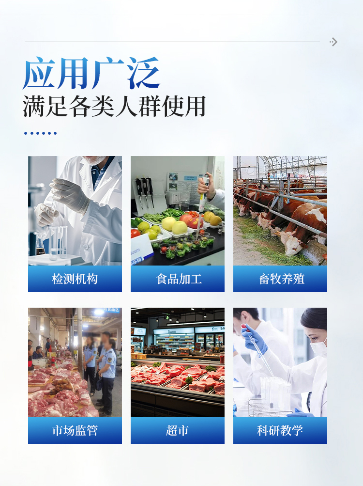 主要应用场景:养殖场/屠宰场、食品加工企业、市场监管部门(食药监、农业农村部等)、第三方检测机构、农产品批发市场/超市、科研院所。